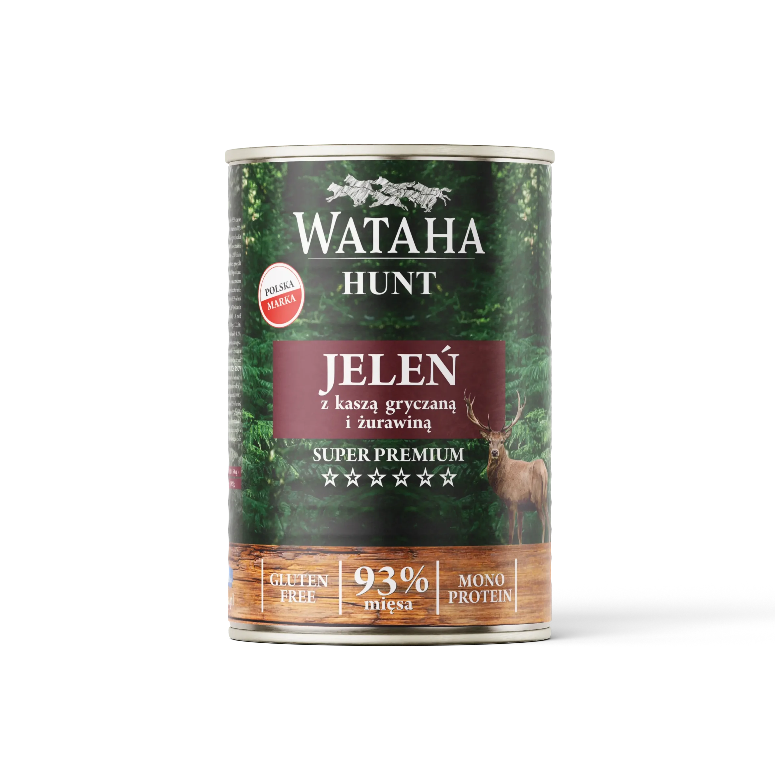 Skład: 93% jeleń (100% mięsa mięśniowego), 5% kasza gryczana, 1% żurawina, 1% witaminy i minerały.